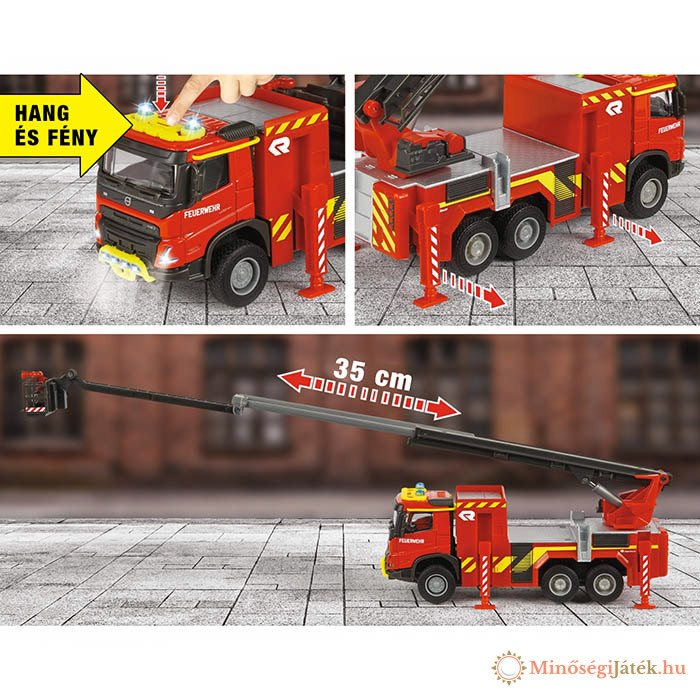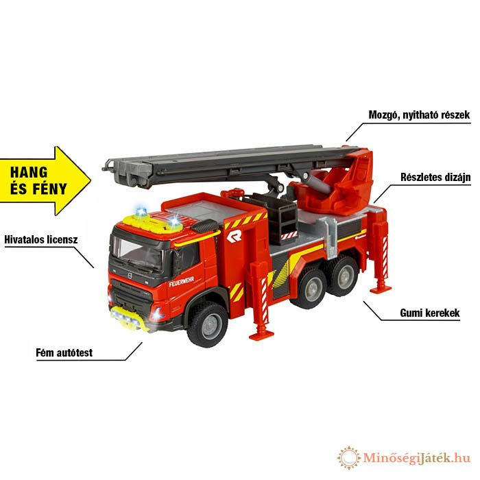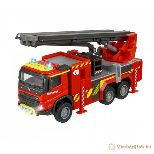 Majorette – Volvo tűzoltóautó (19 cm) – prémium modell jármű kihajtható létrával és gumiabroncsokkal, játék tűzoltóautó fény- és hangeffektusokkal, 3 éves kortól